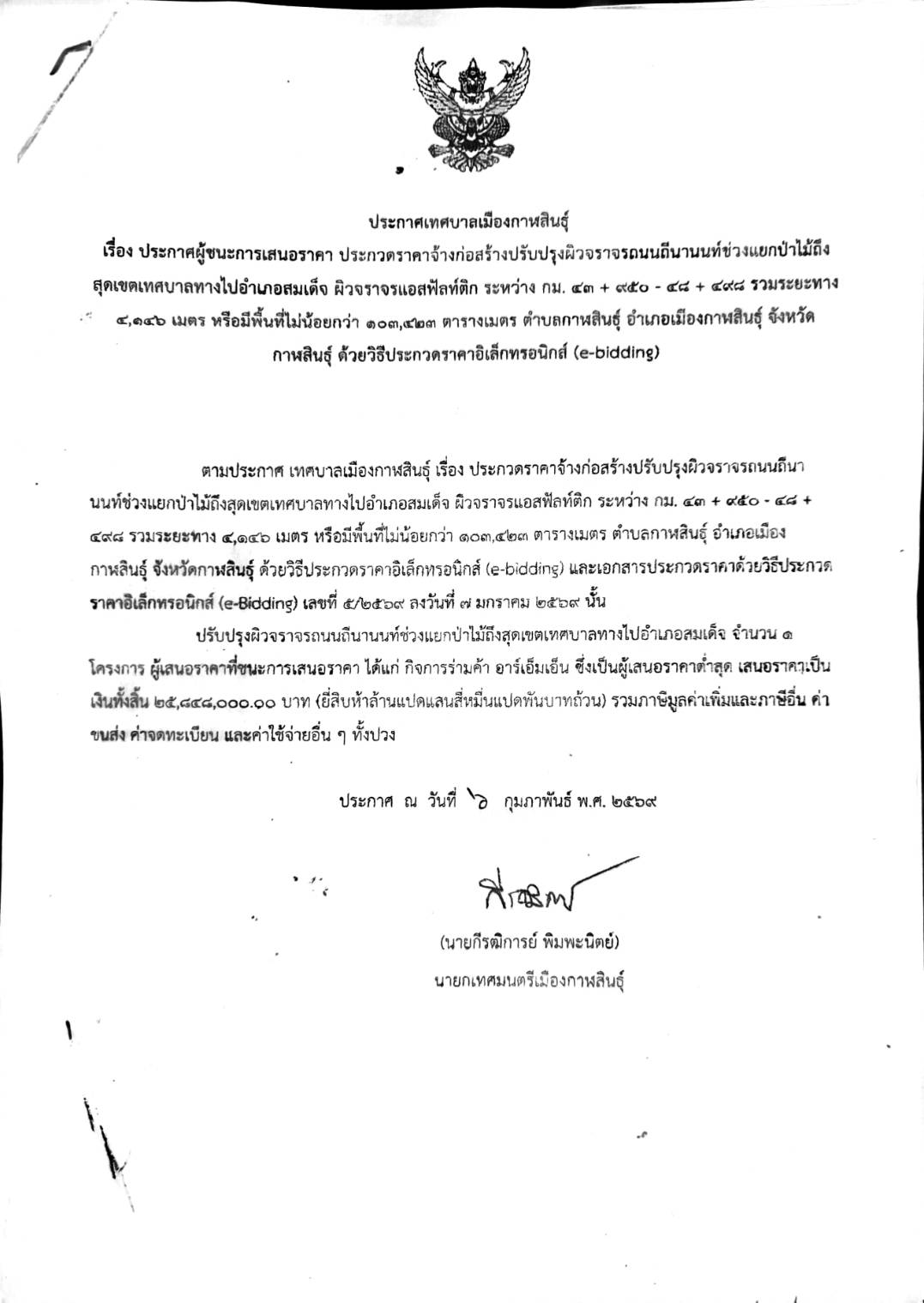 - ประกาศเทศบาลเมืองกาฬสินธุ์ เรื่อง ประกวดราคาจ้างก่อสร้างติดตั้งโคมไฟฟ้าแสงสว่างแบบ LED ขนาด ๑๕๐ w ถนนอนรรฆนาคด้วยวิธีประกวดราคาอิเล็กทรอนิคส์