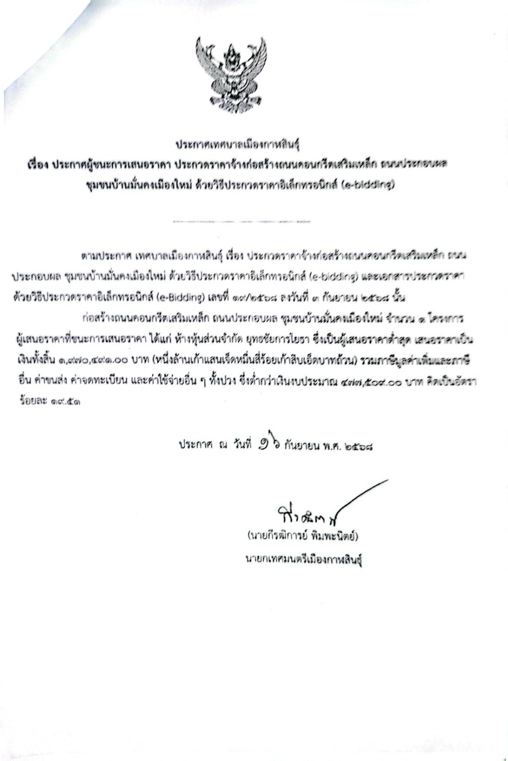 ประกาศผู้ชนะการเสนอราคา ประกวดราคาจ้างก่อสร้างถนนคอนกรีตเสริมเหล็ก ซอยสุขสบายใจ ๔.๗ ชุมชนเทศบาลใหม่ ด้วยวิธีประกวดราคาอิเล็กทรอนิกส์ (e-bidding)