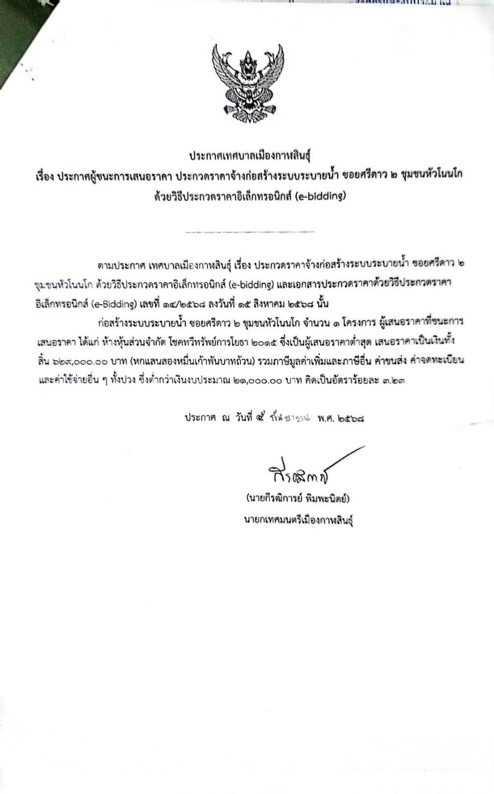 ประกาศผู้ชนะการเสนอราคา ประกวดราคาจ้างก่อสร้างระบบระบายน้ำ ซอยศรีดาว ๒ ชุมชนหัวโนนโก