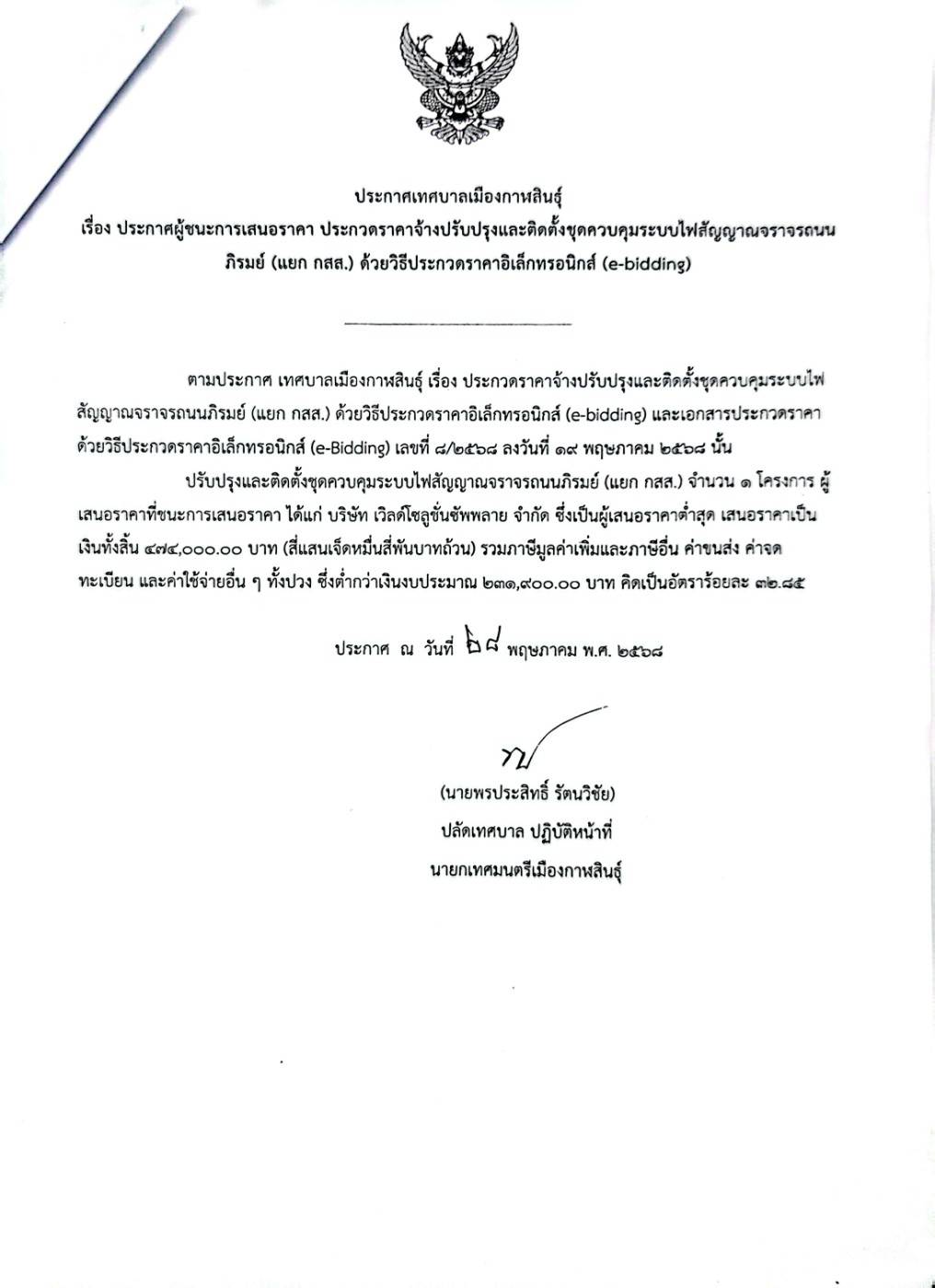 ประกาศผู้ชนะการเสนอราคา ประกวดราคาจ้างปรับปรุงและติดตั้งชุดควบคุมระบบไฟสัญญาณจราจรถนนภิรมย์ (แยก กสส.)