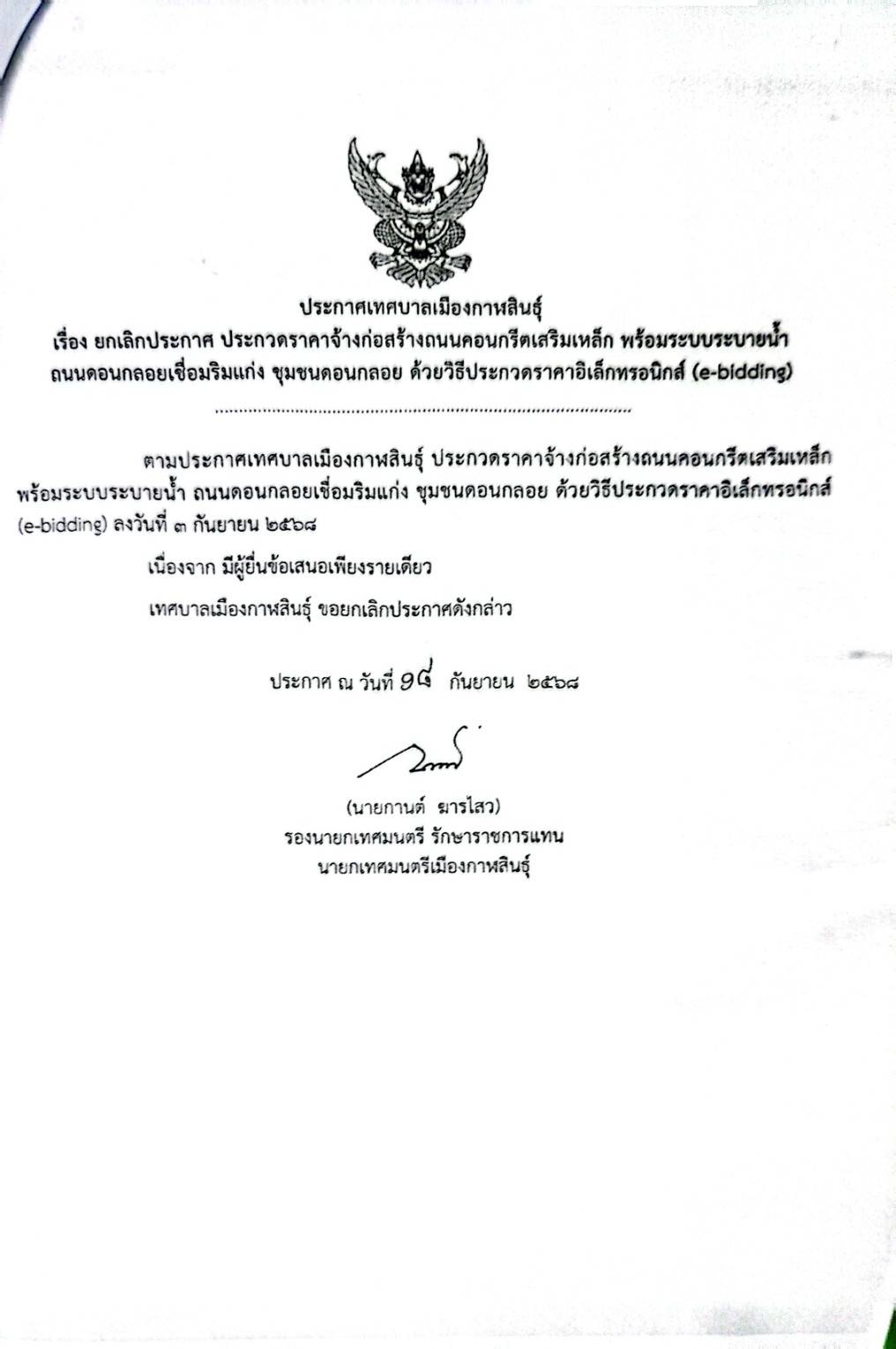 ยกเลิกประกาศ ประกวดราคาจ้างก่อสร้างถนนคอนกรีตเสริมเหล็ก พร้อมระบบระบายน้ำถนนดอนกลอยเชื่อมริมแกร่ง ชุมชนดอนกลอย