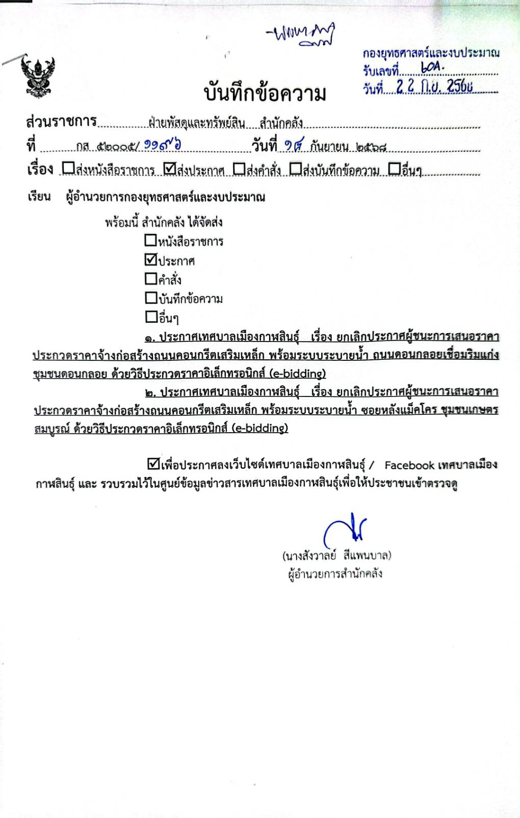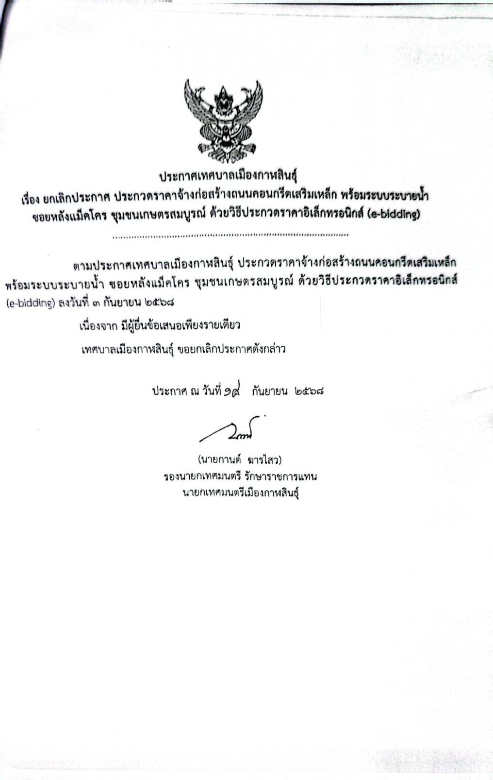 ประกาศเทศบาลเมืองกาฬสินธุืเรื่องประกาศประกวดราคาจ้างก่อสร้างด้วยวิธีประกวดราคาอิเล็กทรอนิกส์ (E-Bidding) 0eo;o 4F8i'dki